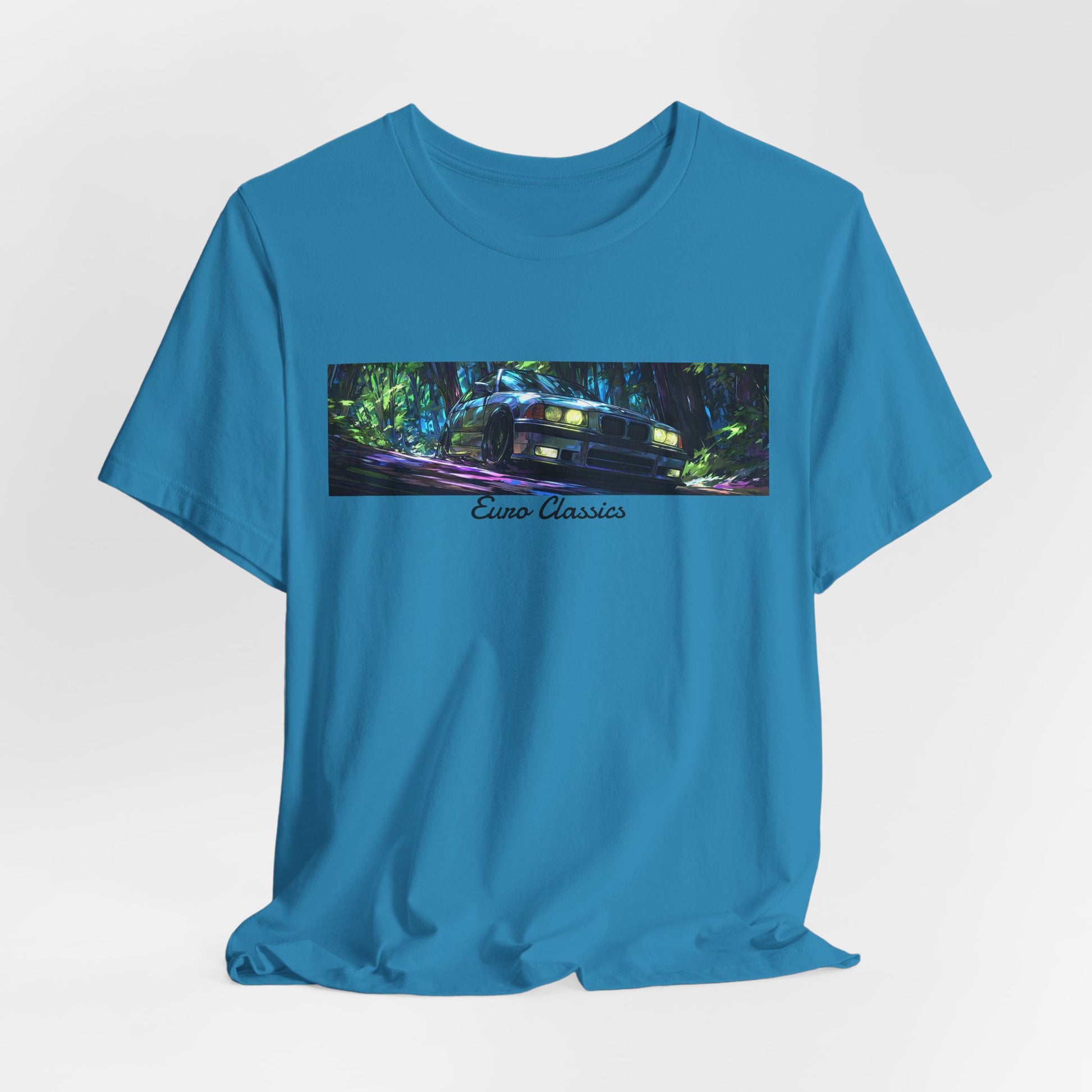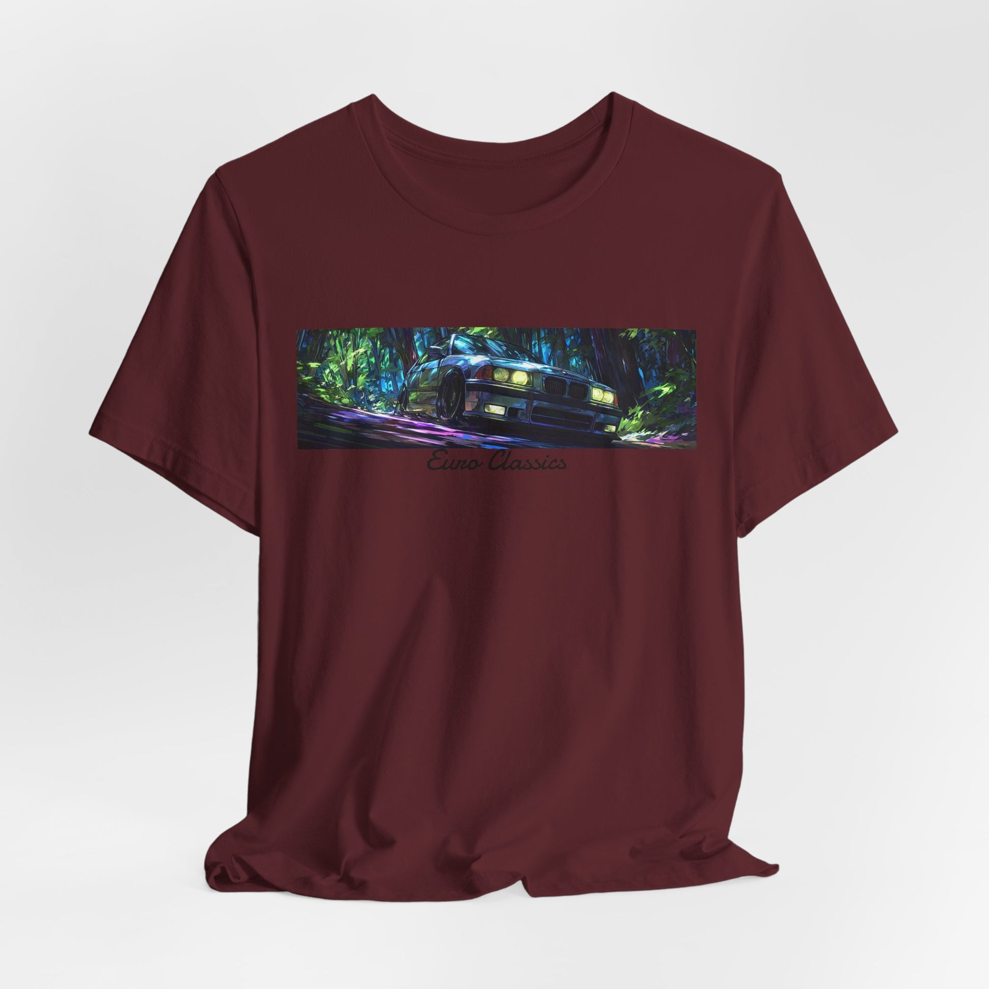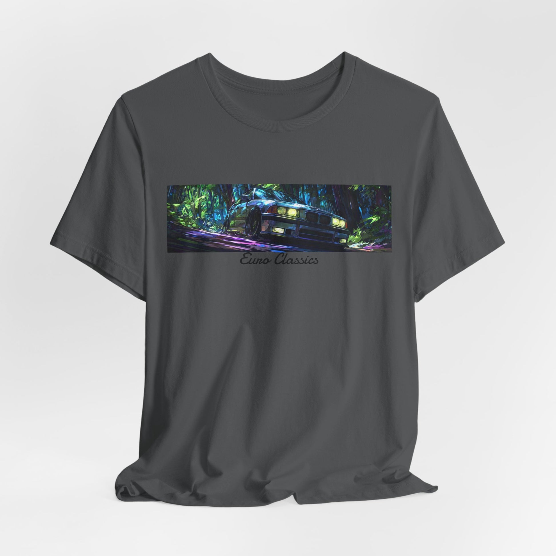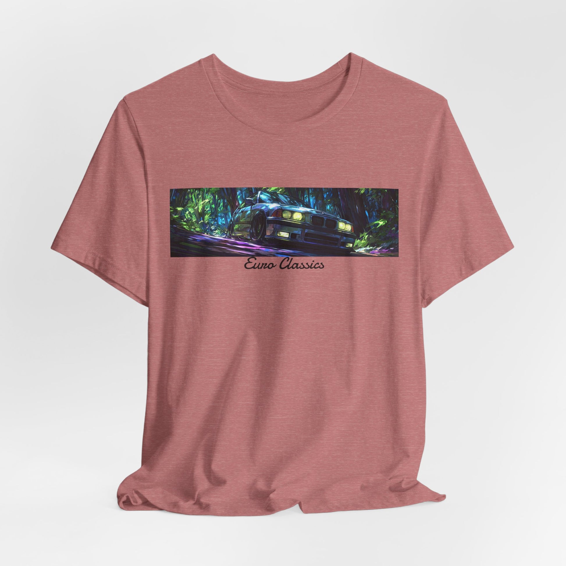 Capture the mood of a late-night cruise with the Classic Euro Drives E36 Graphic T-Shirt. This isn't just a car shirt; it's a vibe. The artwork features a slim, horizontal design across the chest that evokes the feeling of rainy streets and city lights reflecting off a classic E36 chassis.